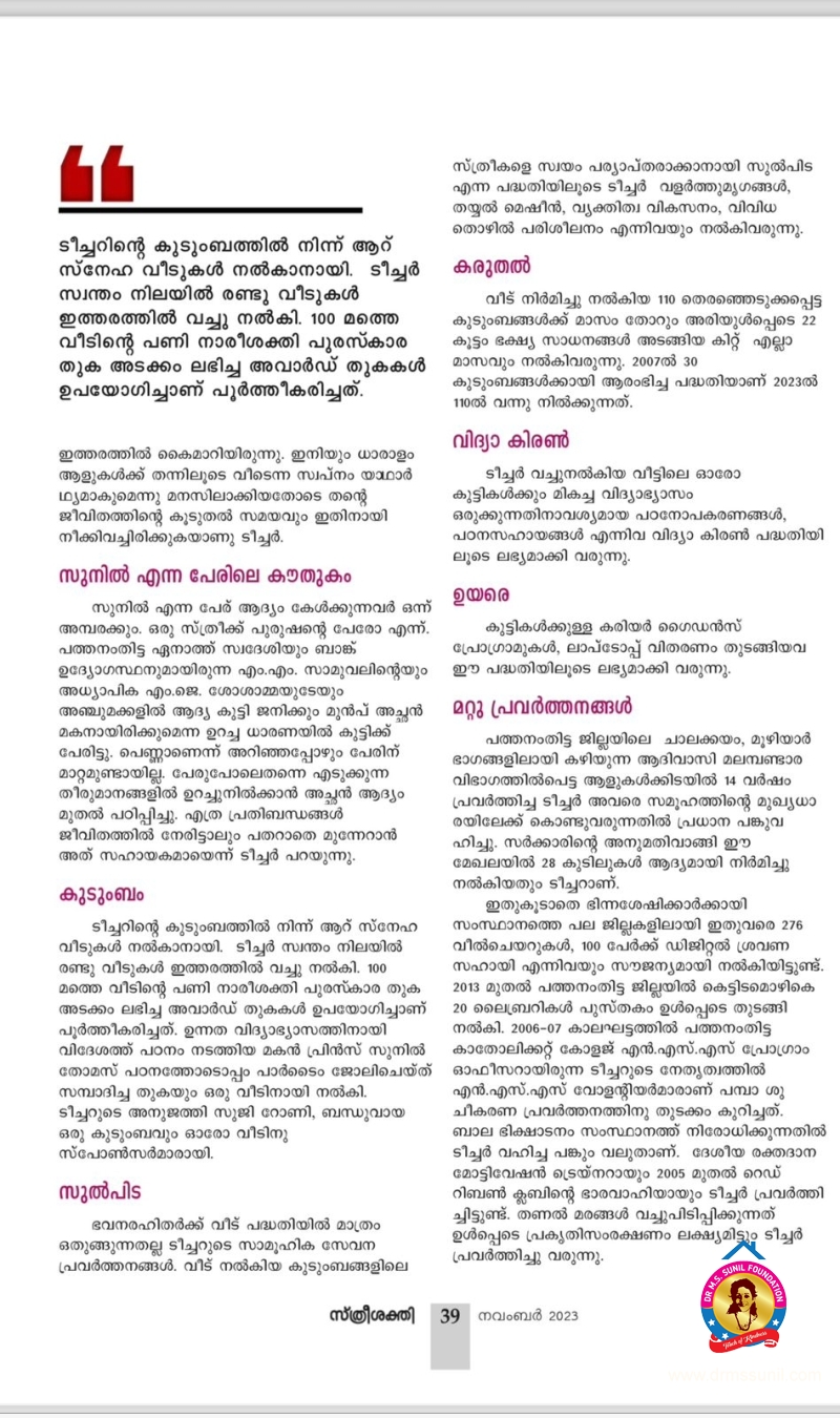 അനേകർക്ക് സ്വപ്‌നഭവനം ഒരുക്കി സുനിൽ ടീച്ചർ