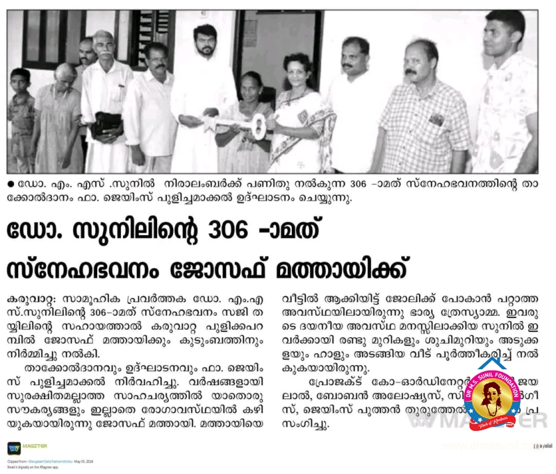 306- മത് സ്നേഹഭവനം ജോസഫ് മത്തായിക്കും കുടുംബത്തിനും നൽകി
