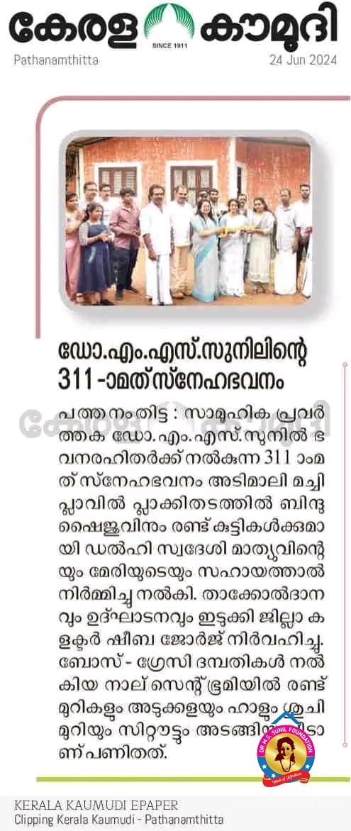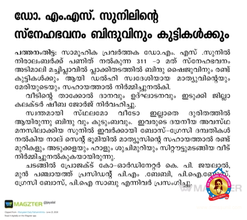 311-മത് സ്നേഹഭവനം ബിന്ദുവിനും കുടുംബത്തിനും