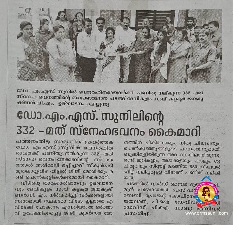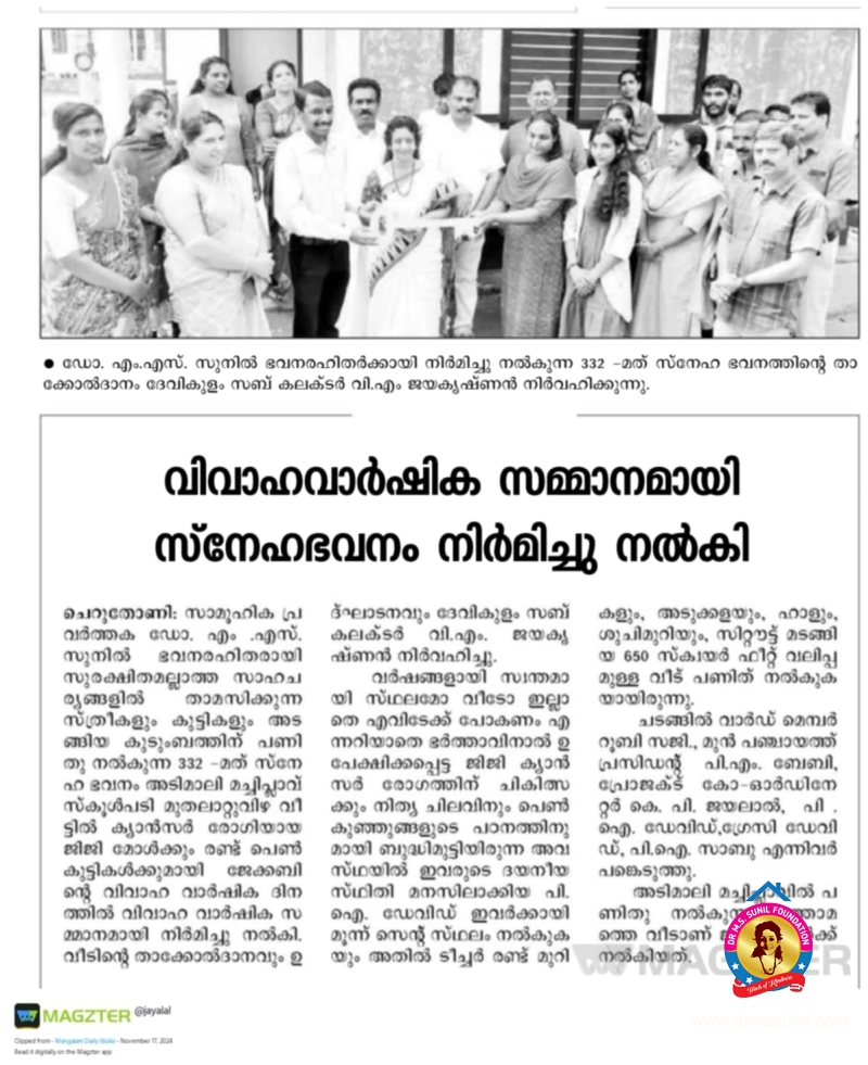 വിവാഹ വാർഷിക സമ്മാനമായി ജിജിക്ക് സ്നേഹഭവനം കൈമാറി