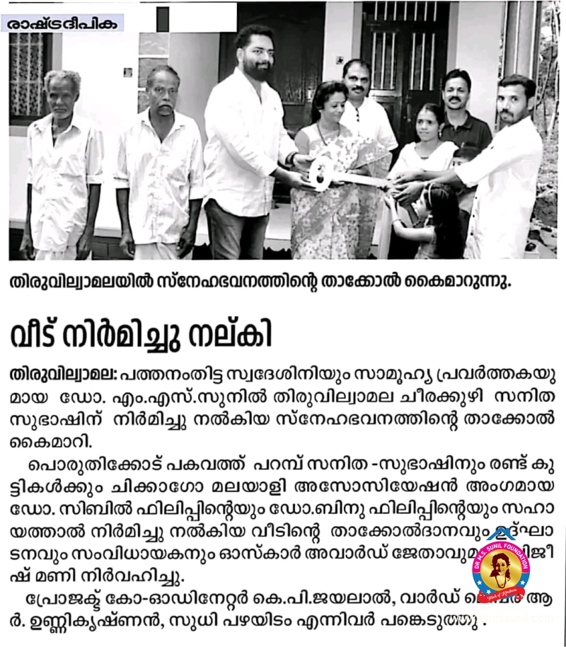 330- മത് സ്നേഹഭവനം സൂര്യയ്ക്കും കുടുംബത്തിനും നൽകി.