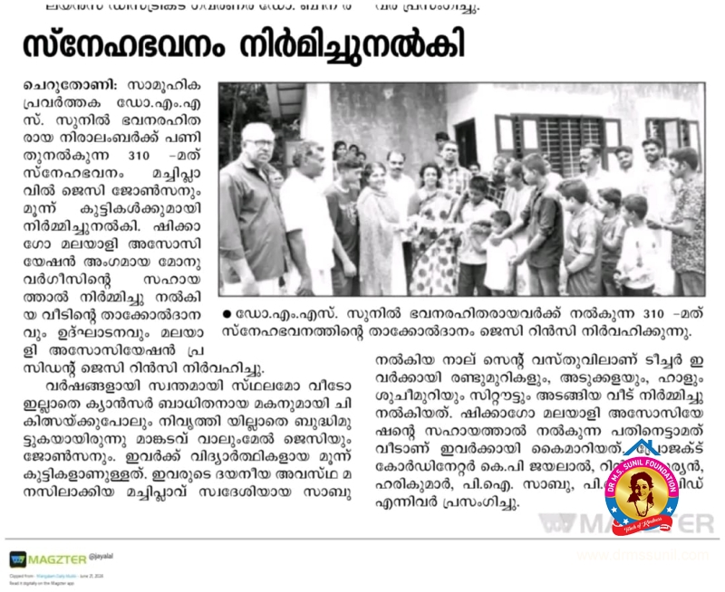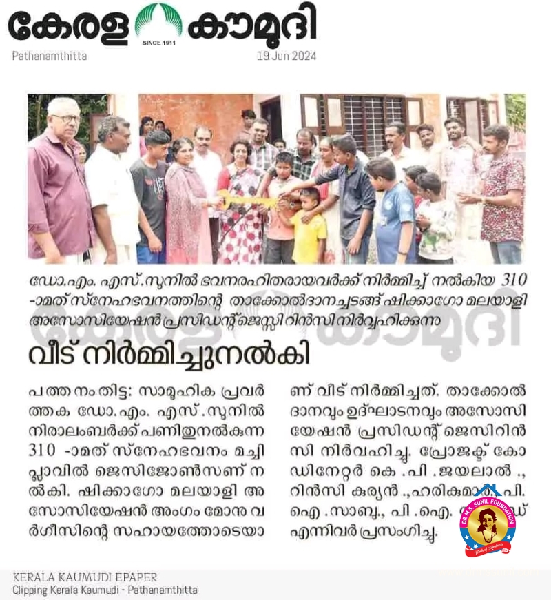 330- മത് സ്നേഹഭവനം സൂര്യയ്ക്കും കുടുംബത്തിനും നൽകി.